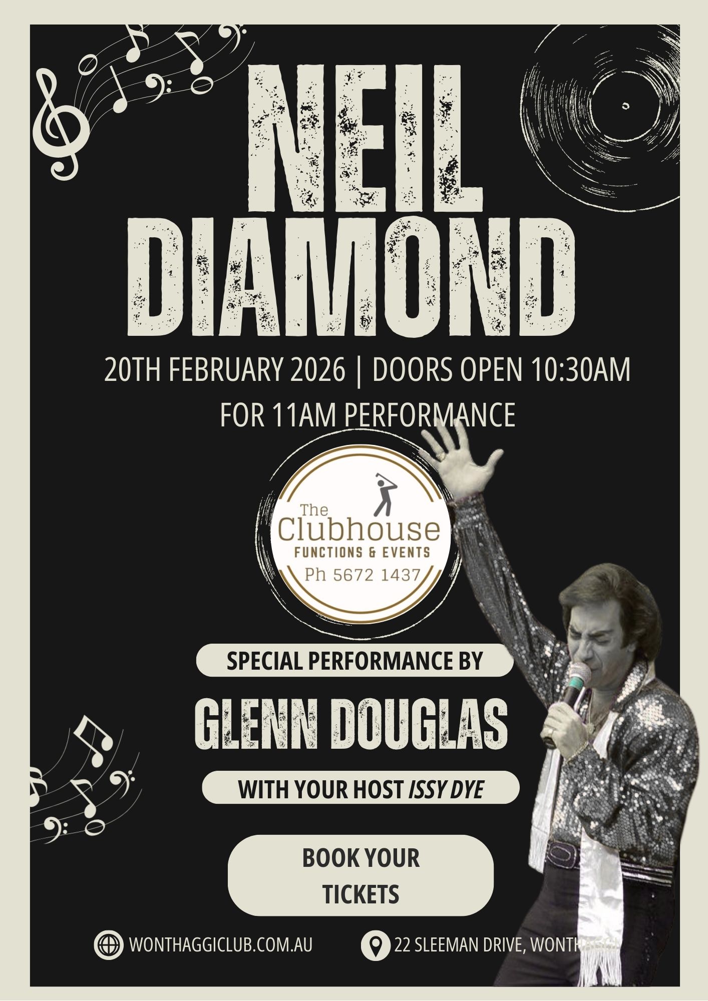 Enjoy a Neil Diamond Tribute Show live at The Clubhouse, Wonthaggi Golf Club on Friday 20 February 2026, featuring a special performance by Glenn Douglas and hosted by Issy Dye.